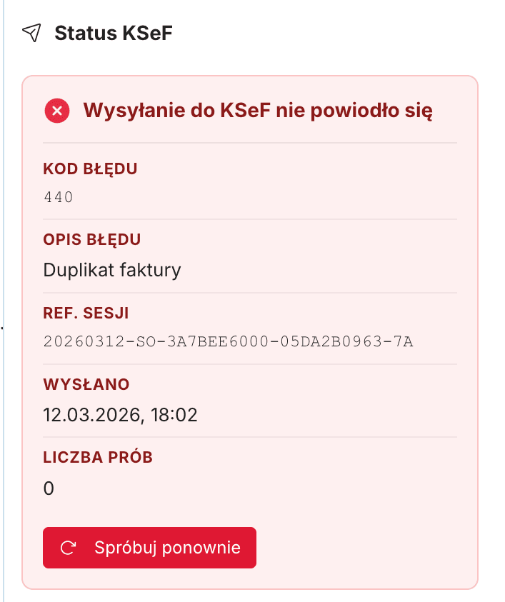 Wysyłka do KSeF nie powiodła się z konkretnego powodu. Musisz sprawdzić przyczynę i naprawić problem.