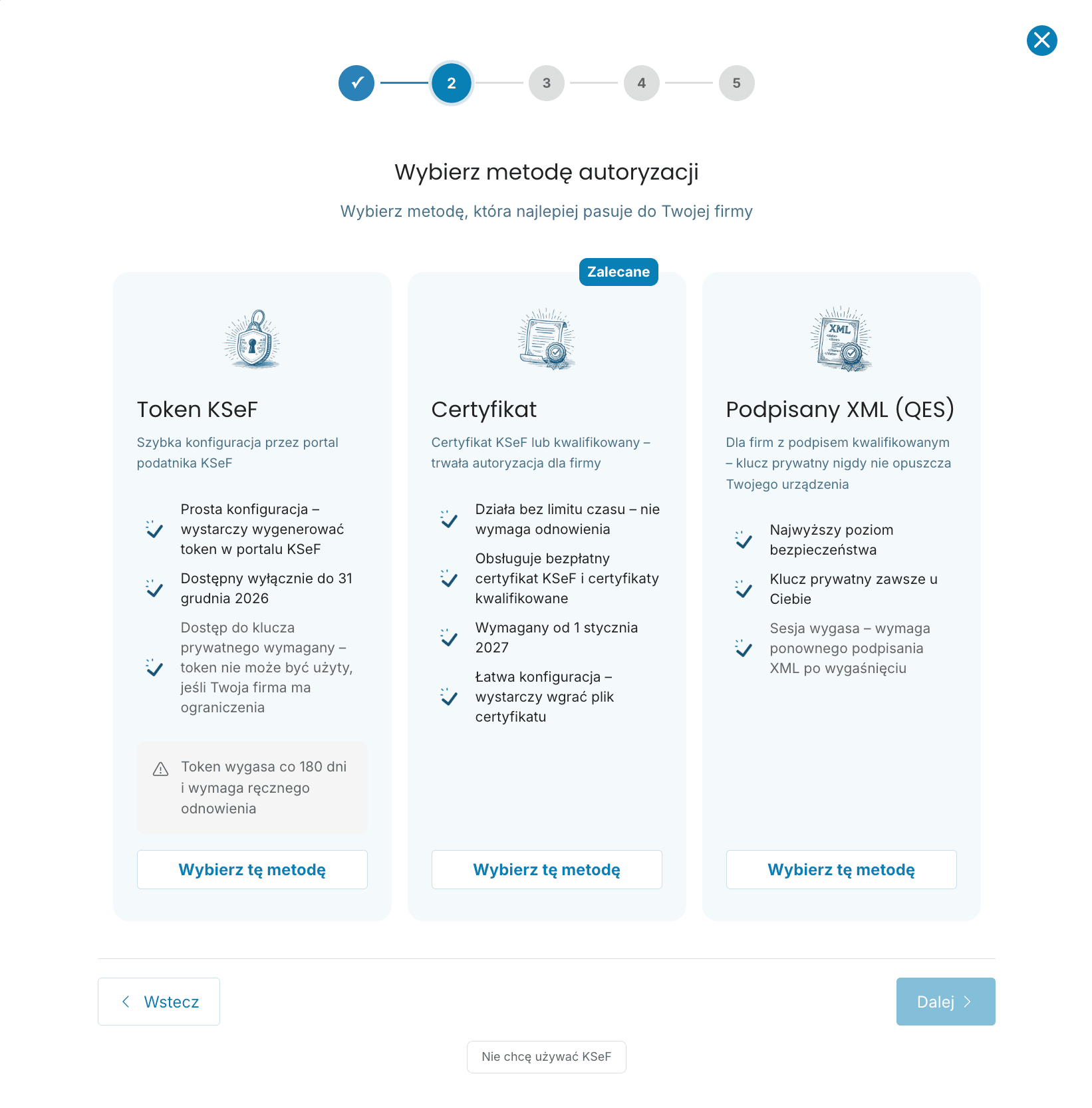 Tokeny KSeF działają do 31 grudnia 2026. Po tej dacie będziesz musiał przejść na certyfikat. Przed wygaśnięciem poinformujemy Cię o konieczności zmiany.