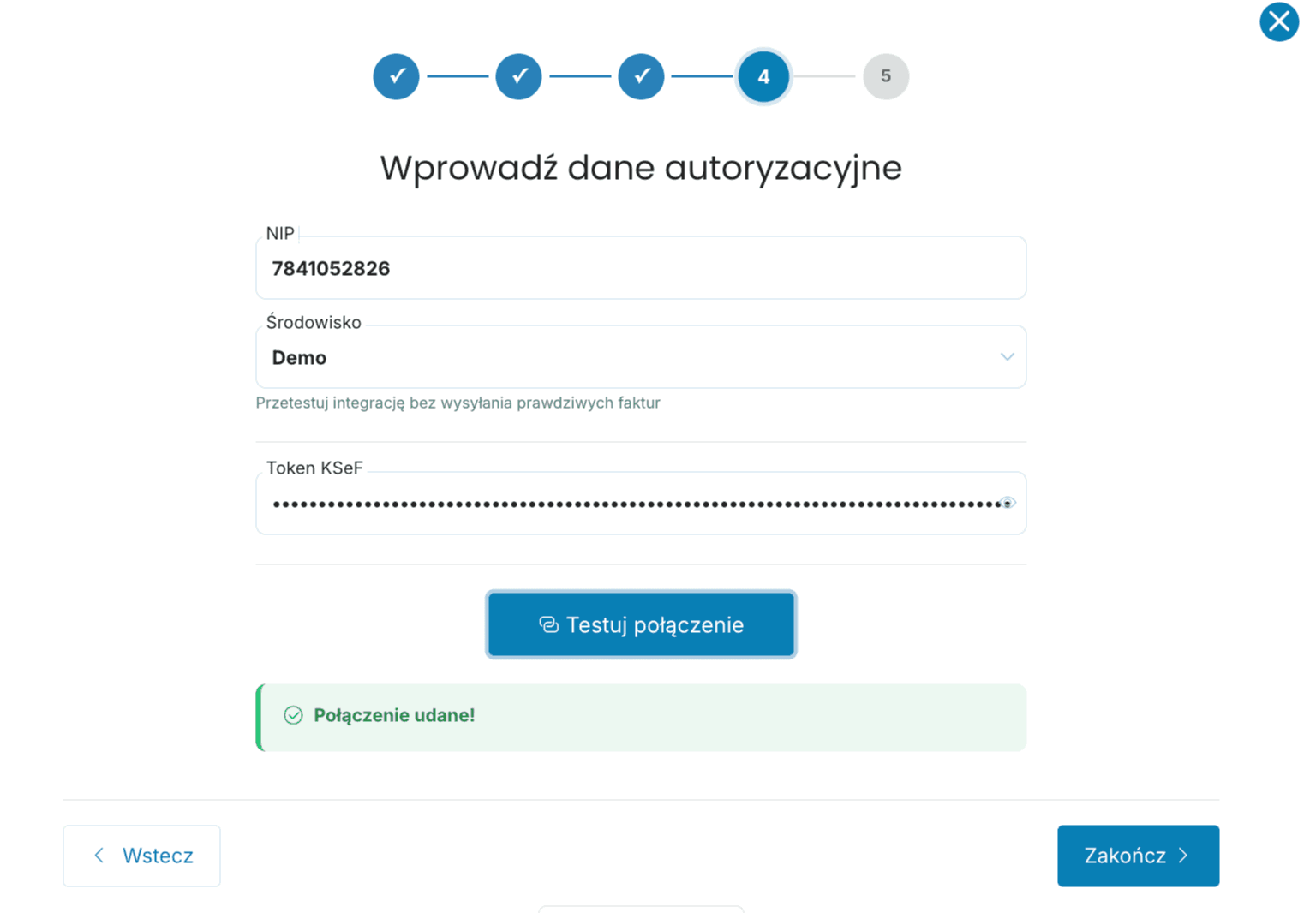 Po pomyślnym teście zobaczysz ekran z potwierdzeniem Sukces! KSeF jest aktywny i gotowy do użycia.