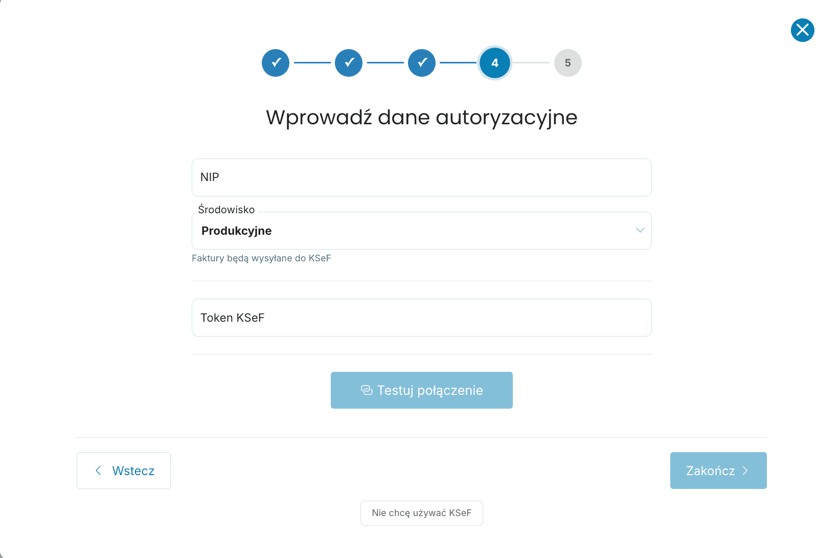 Nie – konfiguracja KSeF jest opcjonalna. Jeśli nie chcesz teraz korzystać z KSeF, wybierz „Nie chcę używać KSeF" w kreatorze. Pamiętaj jednak, że od kwietnia 2026 KSeF będzie obowiązkowy dla większości przedsiębiorców.