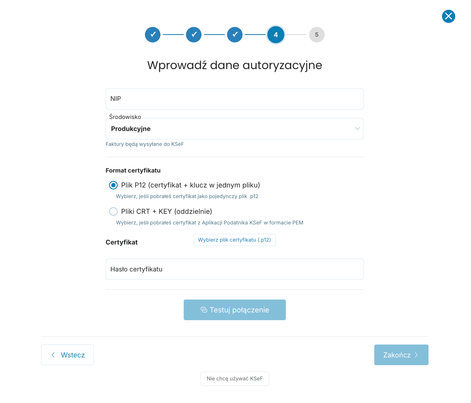Dla P12: kliknij „Wybierz plik" i wskaż plik .p12