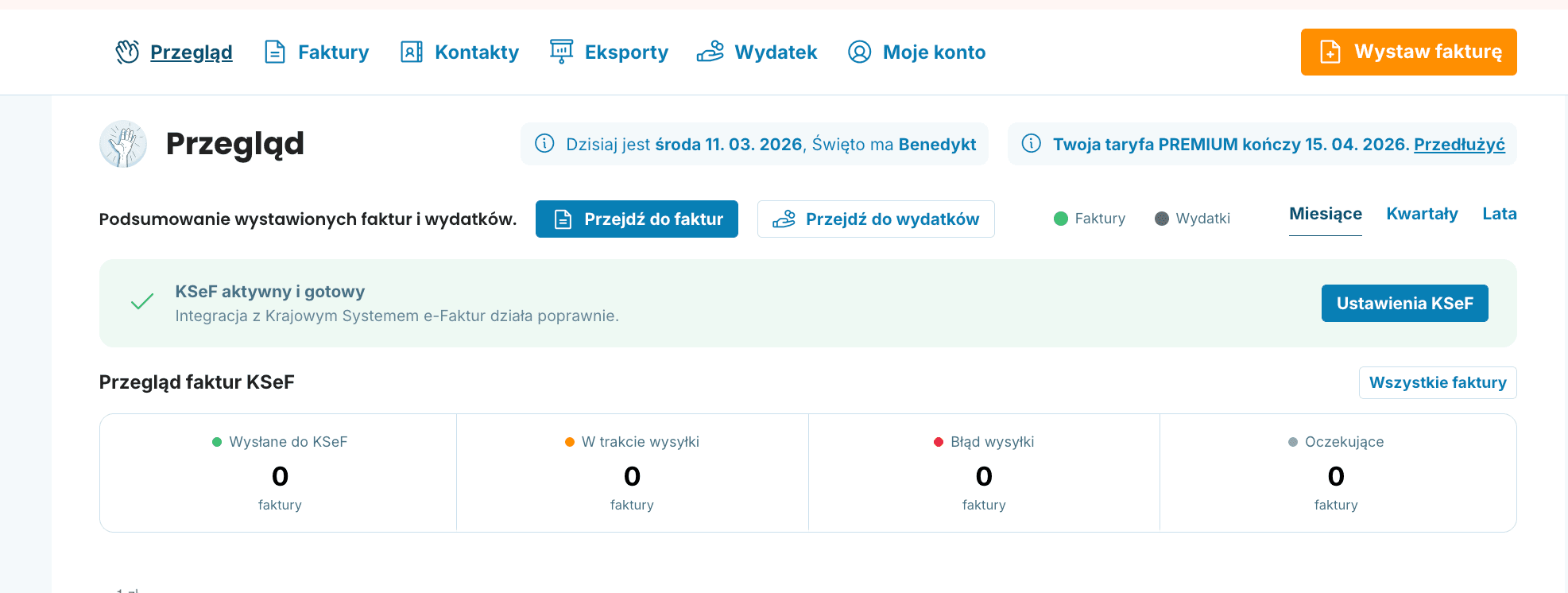 Na dashboardzie pojawi się zielony banner KSeF aktywny i gotowy. Od teraz możesz wystawiać faktury bezpośrednio do Krajowego Systemu e-Faktur.