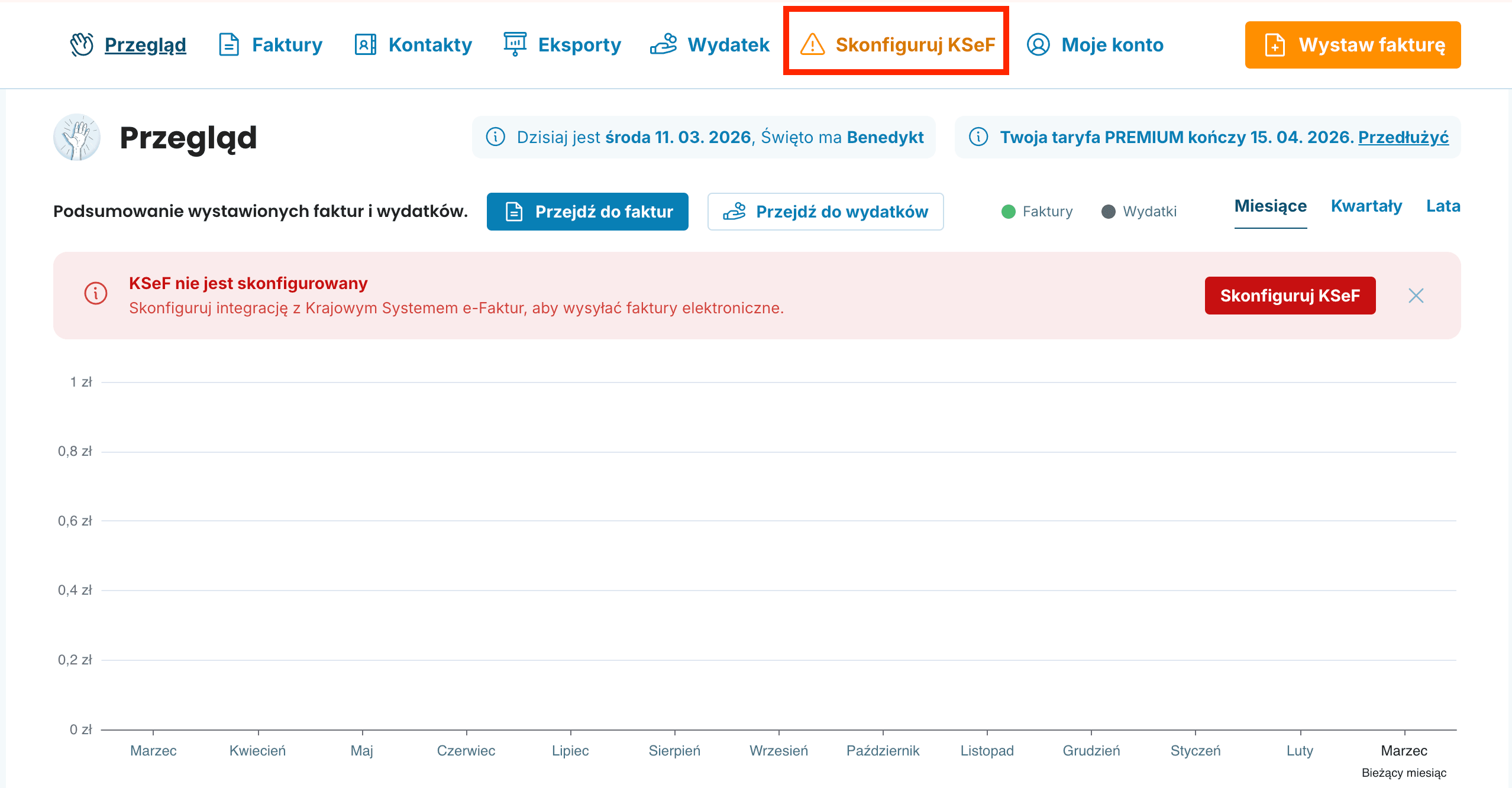 Po zalogowaniu do OnlineFakturowanie kliknij Skonfiguruj KSeF. Znajdziesz tę opcję na dashboardzie (pomarańczowy banner) lub w górnym menu obok zakładki Wydatki.