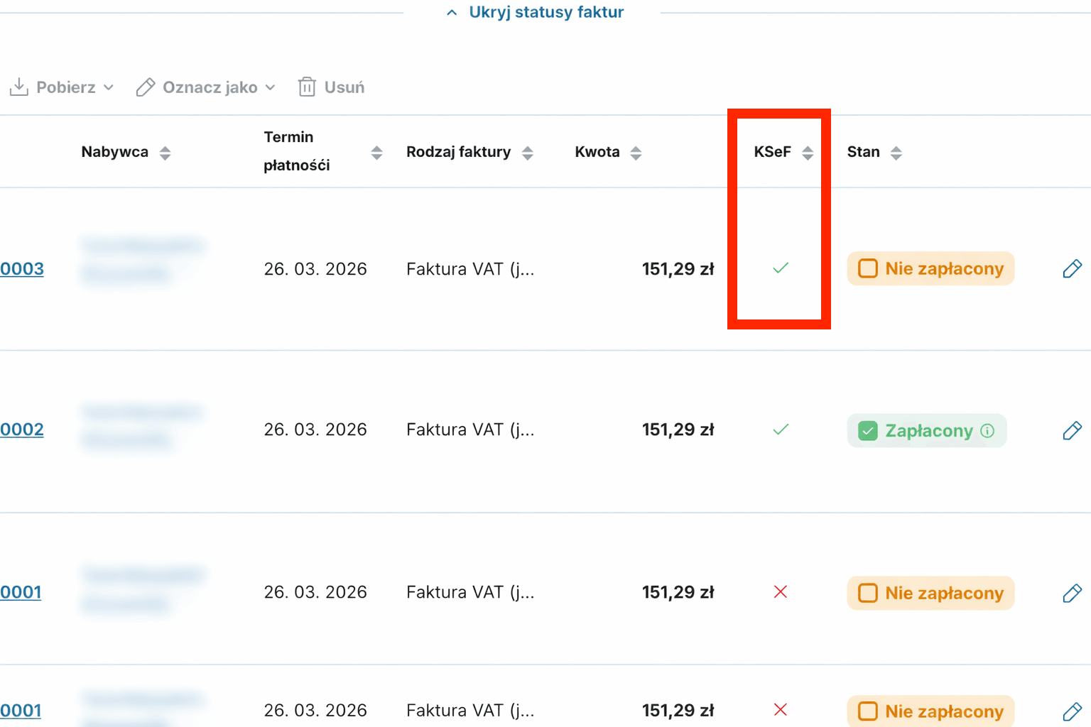 Po wystawieniu faktury przejdź do Wystawione faktury. Zobaczysz nową kolumnę KSeF z aktualnym statusem każdej faktury.