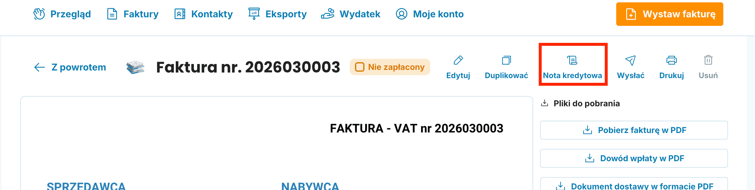 Kliknij Wystaw fakturę