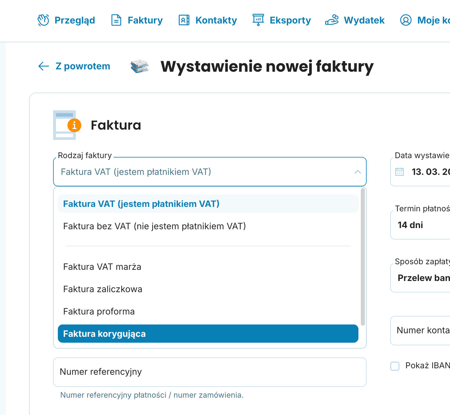 W polu Rodzaj dokumentu wybierz Faktura korygująca